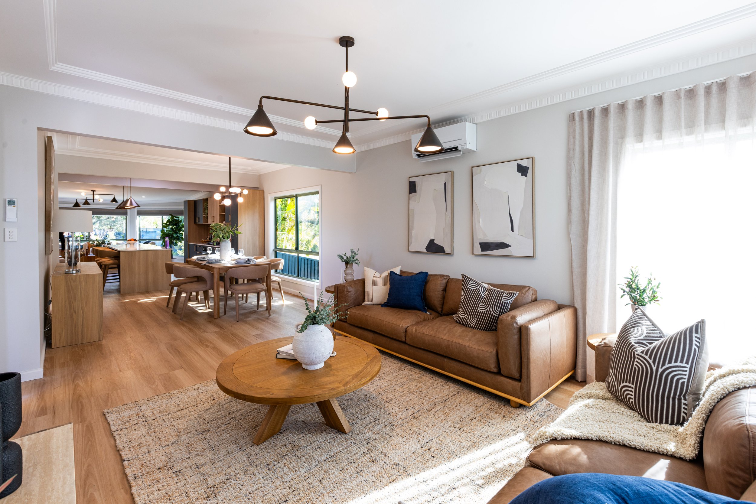 Heavy mismatched curtains were replaced with Veneta honeycomb blinds and S‑fold curtains in light-filtering fabrics to soften the light and modernise the feel, and I introduced warm bronze and black accents throughout, including Miller 6‑light pendants and Sienna pendants from Beacon Lighting. These added gentle warmth and helped replace the gloomy, uneven lighting. The result was a home that finally flowed.