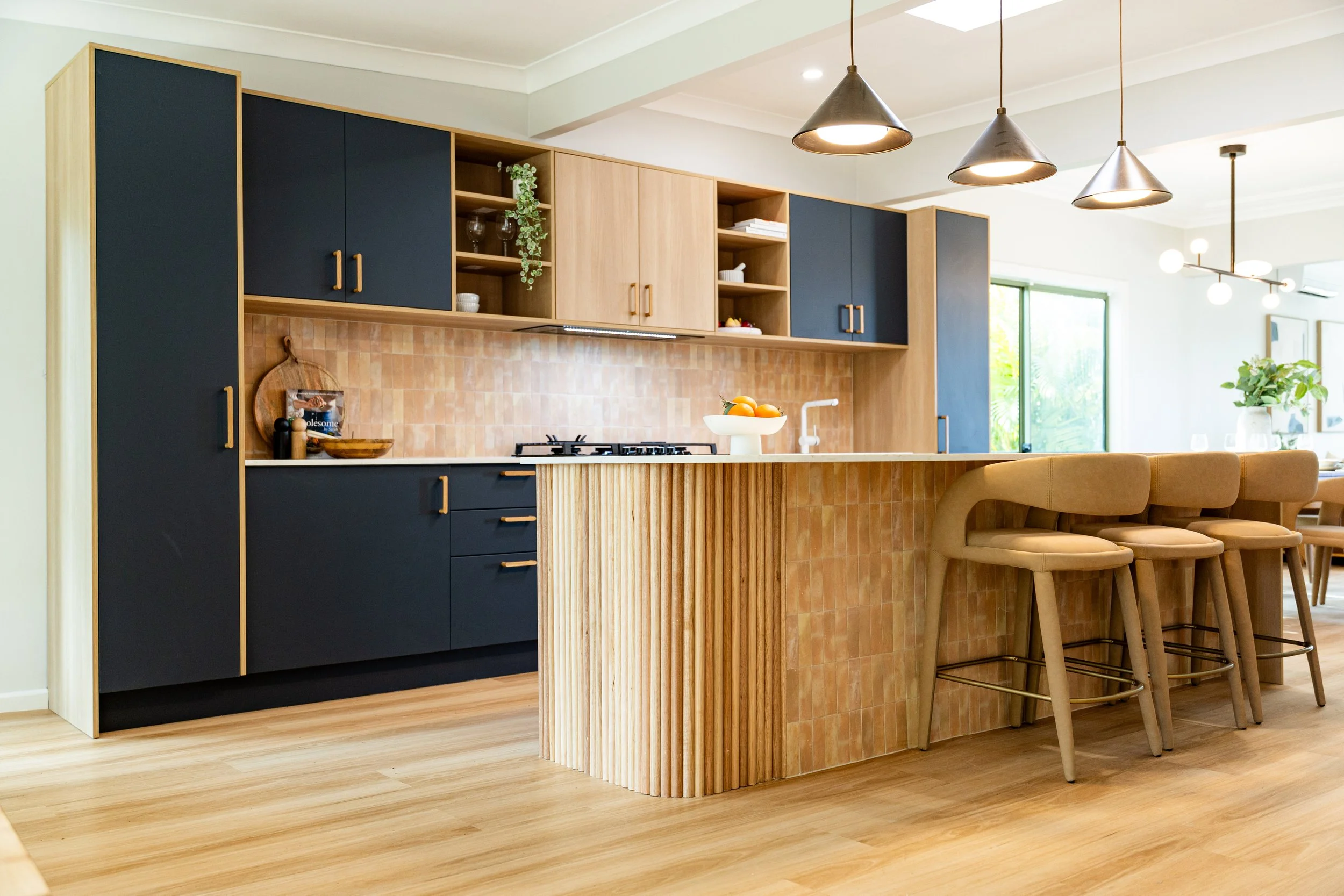 We used Kaboodle cabinetry with doors and panels from Tesrol in Deep Blue Superclean front panels paired with Genuine Oak accents to add warmth and a mid‑century nod that fitted the home’s bones. The island received matching deep blue panels with oak tops and shadowlines to give it a custom feel on a DIY‑friendly budget.
